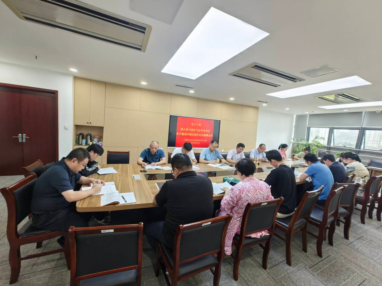 党委于6月12日上午在科技楼2-523会议室开展2024年第五次中心组学习,此次学习主题为“深入学习领会习近平总书记关于推进中国式现代化的重要论述。”。学院党委书记陈冠亚主持学习。
