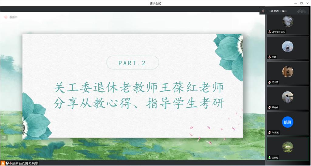 近期线上举办了“以梦为马,一‘研’为定”考研分享会,2022届四位成功考取研究生的学生进行了经验分享。会议邀请了学院关工委退休老教师王葆红和大二、大三有考研意愿的学生参加。院学生第二党支部书记胡鸣老师主持了会议。