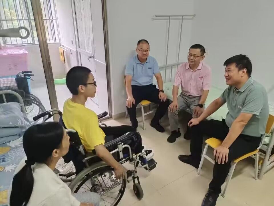 党委书记陈冠亚、院长田祥宏和党委副书记张昊一行,赴北区07栋看望今年入学的23级残疾新生周伟,为他送上节日的祝福和关怀。