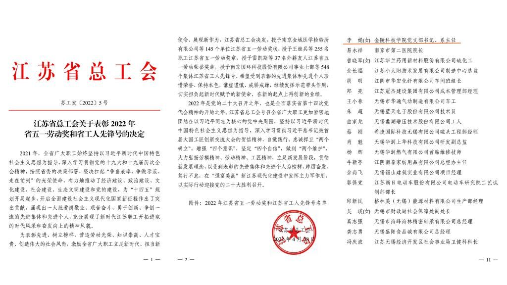 4月28日,江苏省总工会发文表彰2022年省五一劳动奖和省工人先锋号。我校计算机学院李娟被授予江苏省五一劳动奖章。